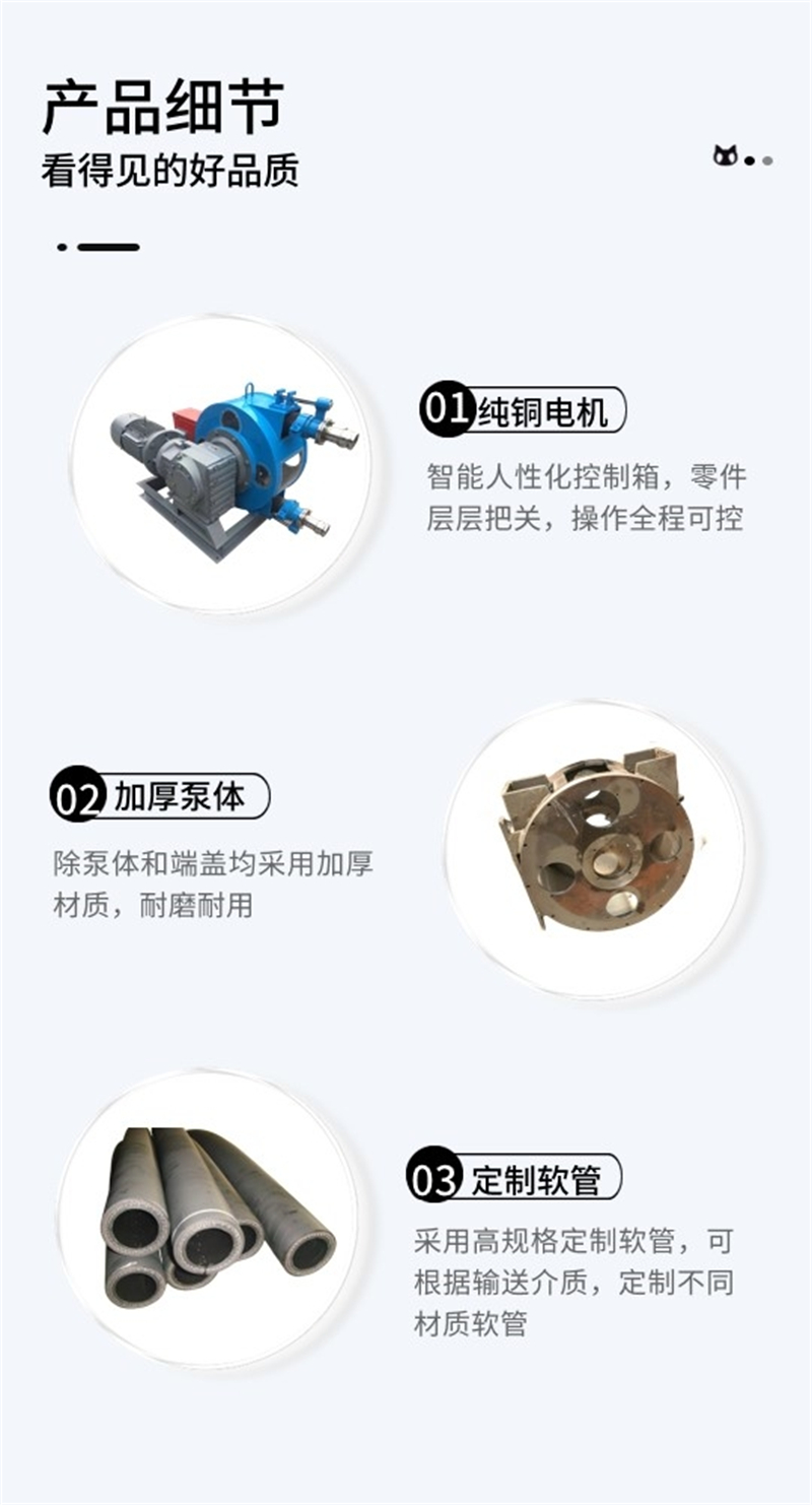 6、具有双向同等流量输送能力;无液体空运转情况下不会对泵的任何部件造成损害;可输送各种具有研磨、腐蚀、氧敏感特性的物料及各种食品等;仅软管为需要替换的部件,更换操作极为简单;除软管外,所输送产品不与任何部件接触。